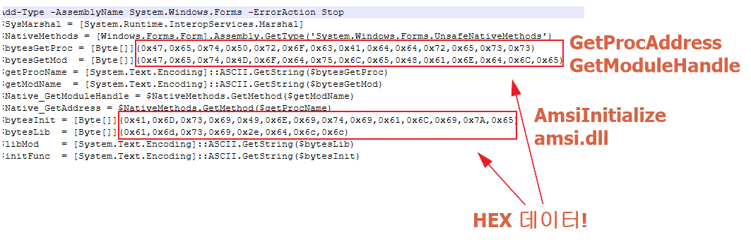 HEX 데이터로 보이는 부분을 텍스트화해서 보니 amsi.dll을 불러오네요