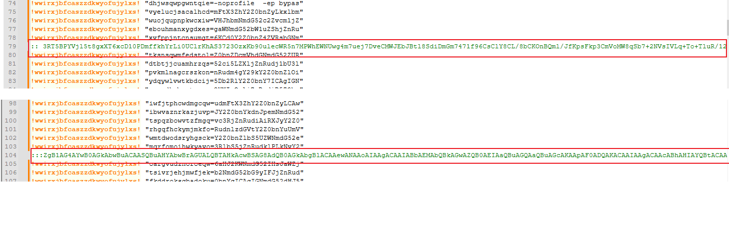 누가 봐도 의심스럽게 생긴 문자열들이 보입니다. :: 랑 ::: 로 구분 된 것을 보니 나중에 따로 사부작 사부작 하는 코드 같쥬?
