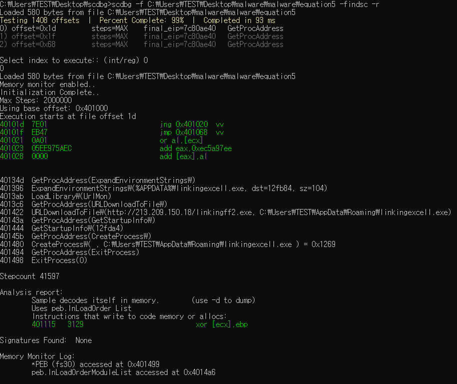 그런다음 scdbg.exe 툴을 이용하여 쉘코가 들어있는지 뽑아내도록 하겠습니다.